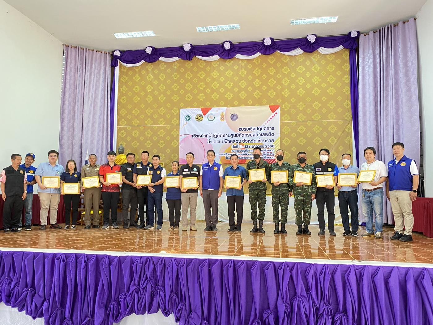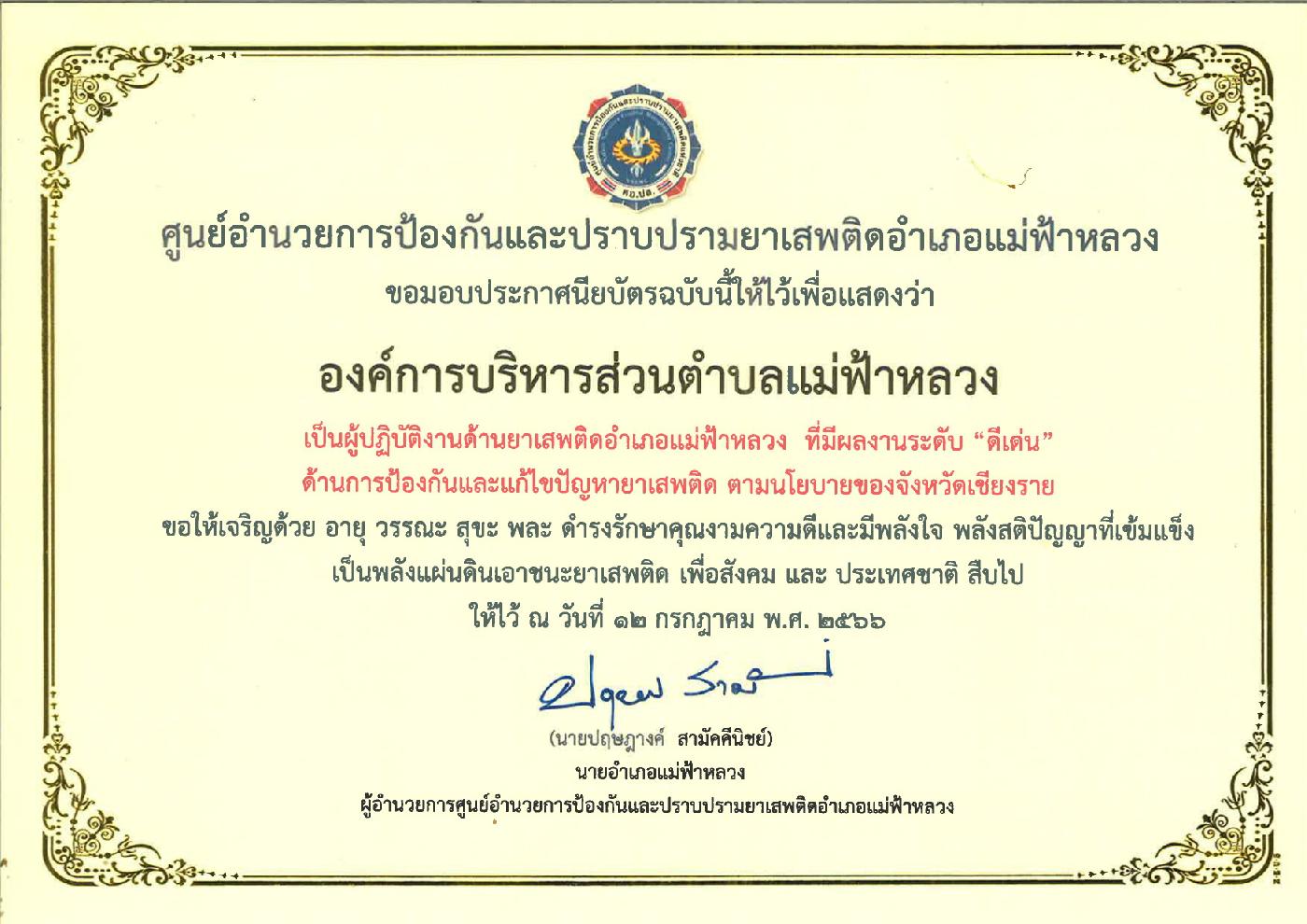 องค์การบริหารส่วนตำบลแม่ฟ้าหลวง เข้าร่วมพิธีรับมอบประกาศนียบัตรผู้ปฏิบัติงานด้านยาเสพติดอำเภอแม่ฟ้าหลวง ที่มีผลงานระดับ “ดีเด่น” ด้านการป้องกันและแก้ไขปัญหายาเสพติด ตามนโยบายของจังหวัดเชียงราย มอบโดย ศูนย์อำนวยการป้องกันและปราบปรามยาเสพติดอำเภอแม่ฟ้าหลวง ณ หอประชุมอำเภอแม่ฟ้าหลวง อำเภอแม่ฟ้าหลวง จังหวัดเชียงราย