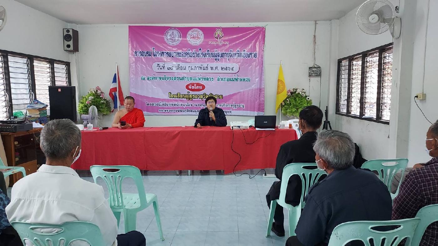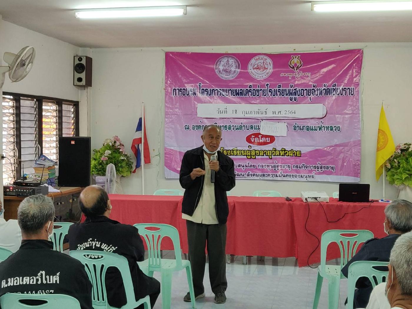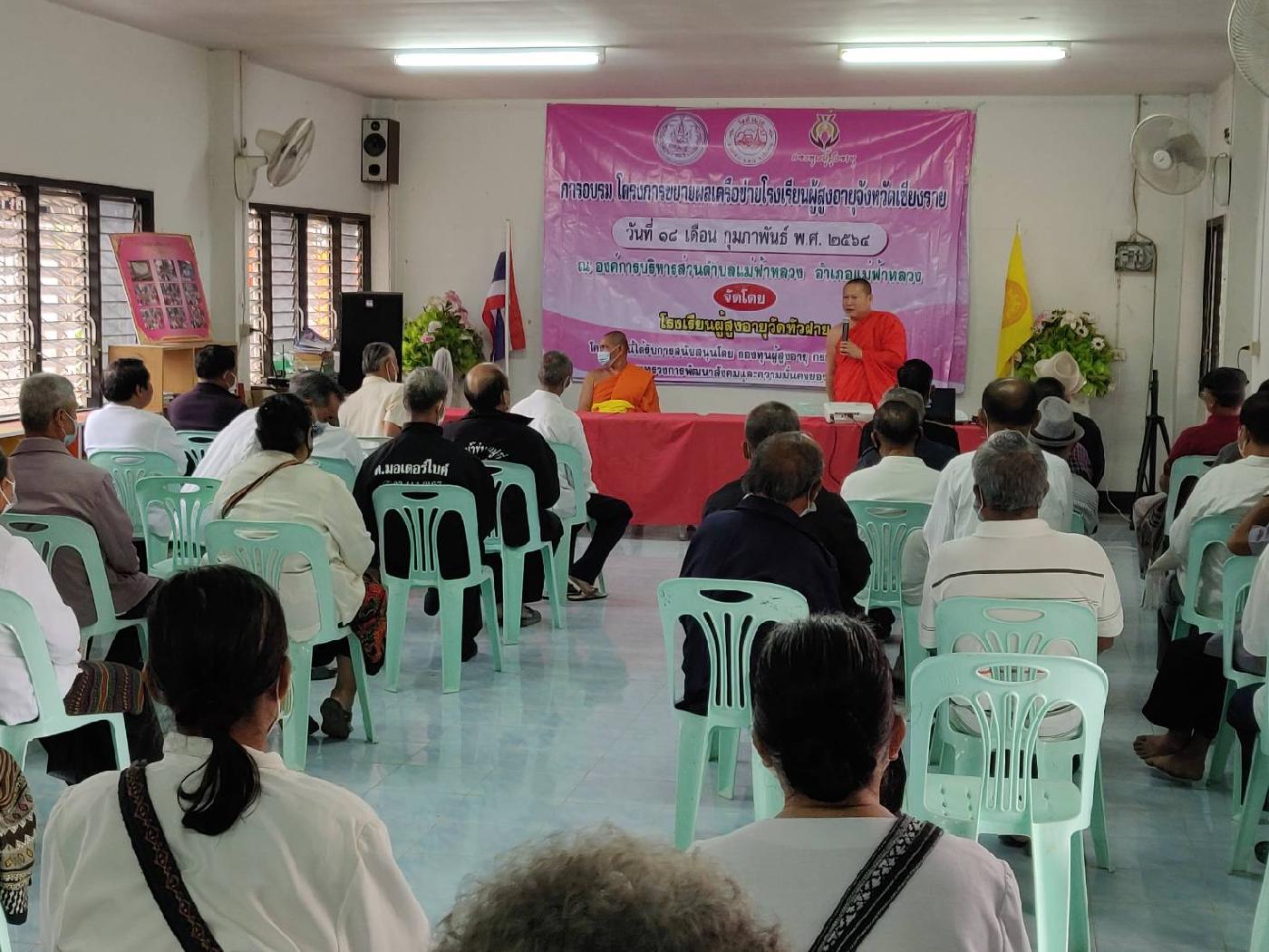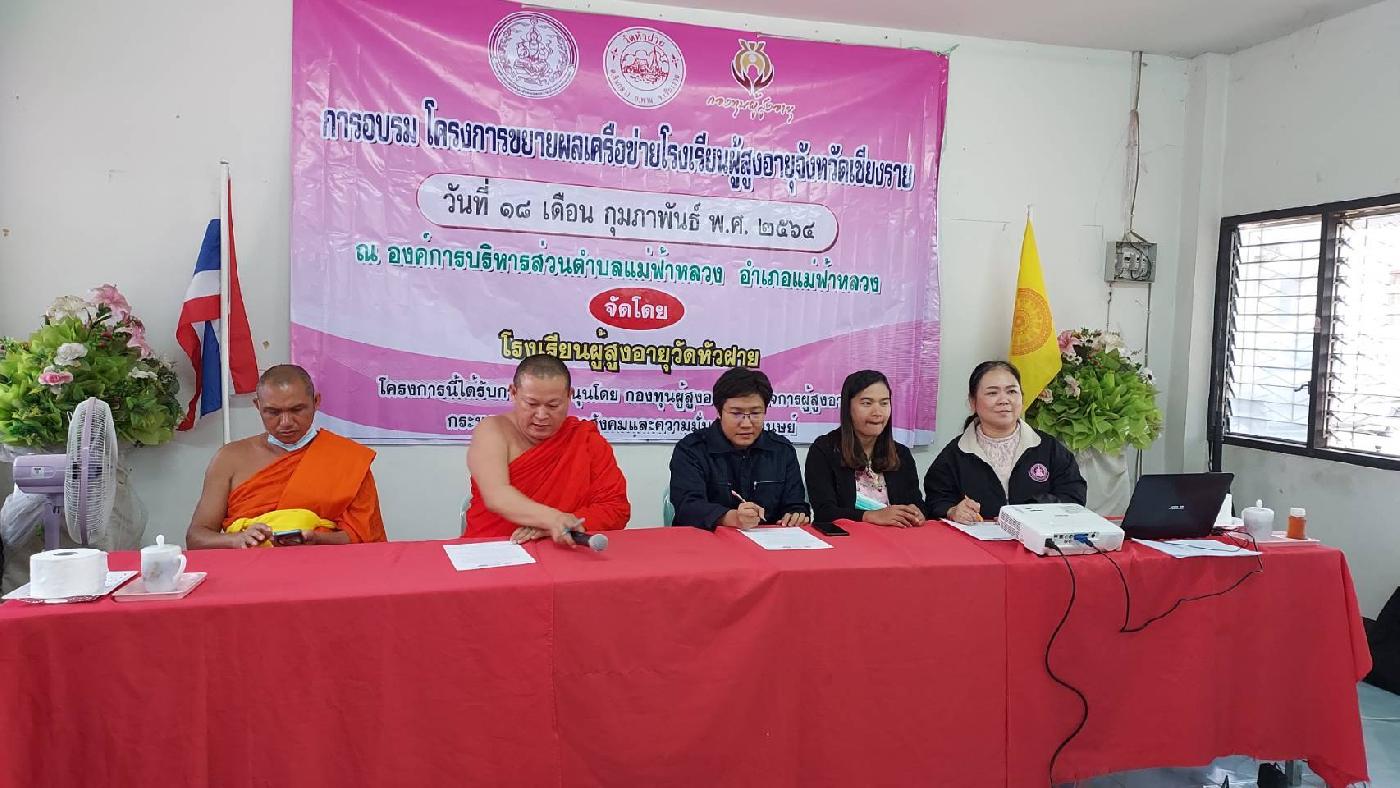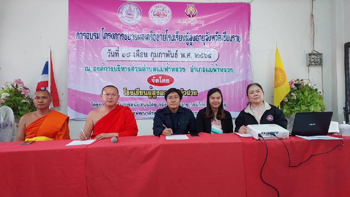 งานพัฒนาชุมชน อบต.แม่ฟ้าหลวง ร่วมกับประธานผู้สูงอายุอำเภอแม่ฟ้าหลวง นายบัณฑิต วงศ์นวล และโรงเรียนผู้สูงอายุวัดหัวฝาย โดย พระครูปิยวรรณพิพัฒน์ ดร. ผู้อำนวยการโรงเรียนผู้สูงอายุวัดหัวฝาย ประธานเครือข่ายโรงเรียนผู้สูงอายุภาคเหนือ จัดการอบรม โครงการขยายผลเครือข่ายโรงเรียนผู้สูงอายุจังหวัดเชียงราย เมื่อวันที่ 18 กุมภาพันธ์ 2564 ณ ศาลาอเนกประสงค์ หมู่ 1 วัดห้วยน้ำขุ่น โดยมีนายวีรชิต วรัญชิตกูล นายกองค์การบริหารส่วนตำบลแม่ฟ้าหลวง เป็นประธานเปิดงาน มีผู้สูงอายุตำบลแม่ฟ้าหลวงเข้าร่วมกิจกรรมจำนวน 50 คน โดยมีเจ้าหน้าที่จากสำนักงานพัฒนาสังคมและความมั่นคงของมนุษย์และครูจากศูนย์การศึกษานอกระบบและการศึกษาตามอัธยาศัยอำเภอแม่ฟ้าหลวง ร่วมให้ความรู้ที่มีประโยชน์กับกลุ่มผู้สูงอายุ ในการนี้งานพัฒนาชุมชน อบต.แม่ฟ้าหลวง ร่วมให้ความรู้ข่าวสารและสิทธิสวัสดิการต่างๆแก่ผู้สูงอายุด้วย