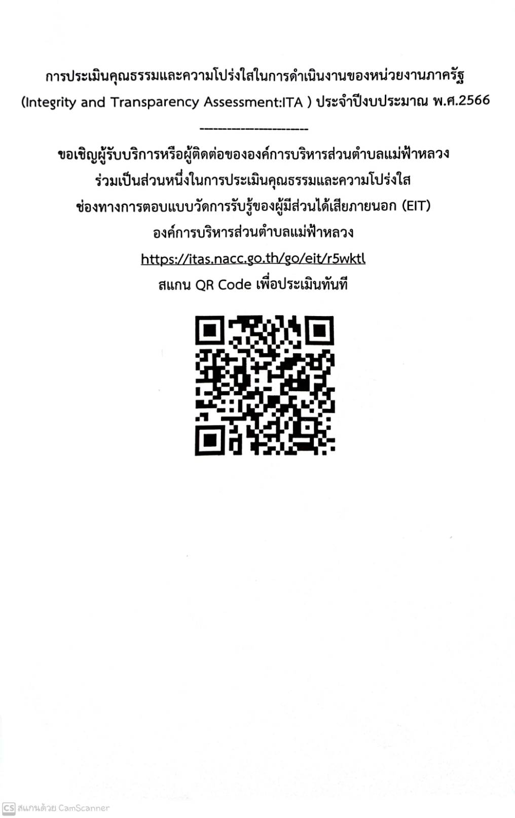 ขอเชิญผู้รับบริการหรือผู้ติดต่อขององค์การบริหารส่วนตำบลแม่ฟ้าหลวง ร่วมเป็นส่วนหนึ่งในการประเมินคุณธรรมและความโปร่งใส