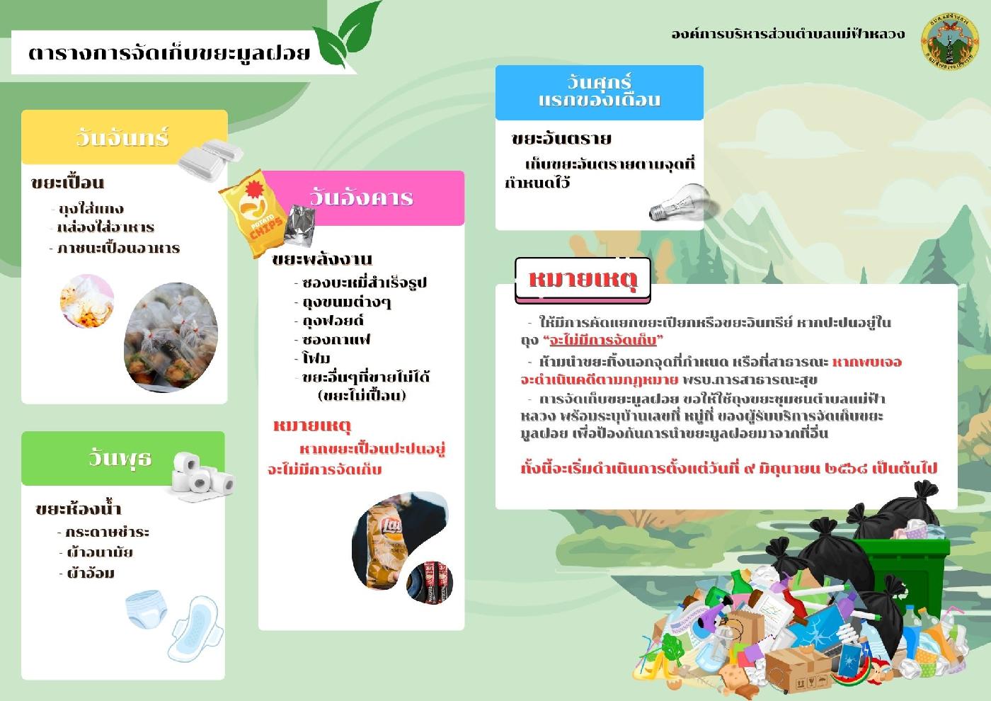 ตามที่ องค์การบริหารส่วนตำบลแม่ฟ้าหลวง ร่วมกับโครงการพัฒนาดอยตุงฯ ได้ดำเนินการจัดการขยะมูลฝอย เพื่อให้การจัดการขยะแต่ละประเภทมีประสิทธิภาพ มลพิษต่ำ