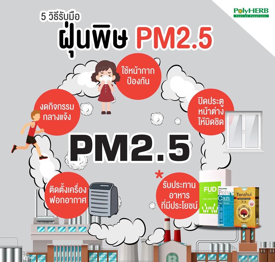 หลายคนอาจไม่ทราบว่าฝุ่น PM 2.5 ไม่เคยหายไปไหนไกล เพียงแต่มีปริมาณลดลงจนเราเผลอนิ่งนอนใจ และไม่ดูแลสุขภาพอย่างต่อเนื่อง ดังนั้น เพื่อสุขภาพที่ดีและห่างไกลจากฝุ่นตัวร้ายอยู่เสมอ ทุกคนควรดูแลสุขภาพให้แข็งแรง รับประทานอาหารที่มีสารต้านอนุมูลอิสระ ออกกำลังกายด้วยการเดินแทนการออกแรงมาก ๆ หากอยู่ในพื้นที่ที่มีค่าฝุ่น PM2.5 เกินมาตรฐานอาจต้องลดทำกิจกรรมกลางแจ้ง พยายามอยู่ภายในอาคาร ปิดประตูและหน้าต่างให้สนิท