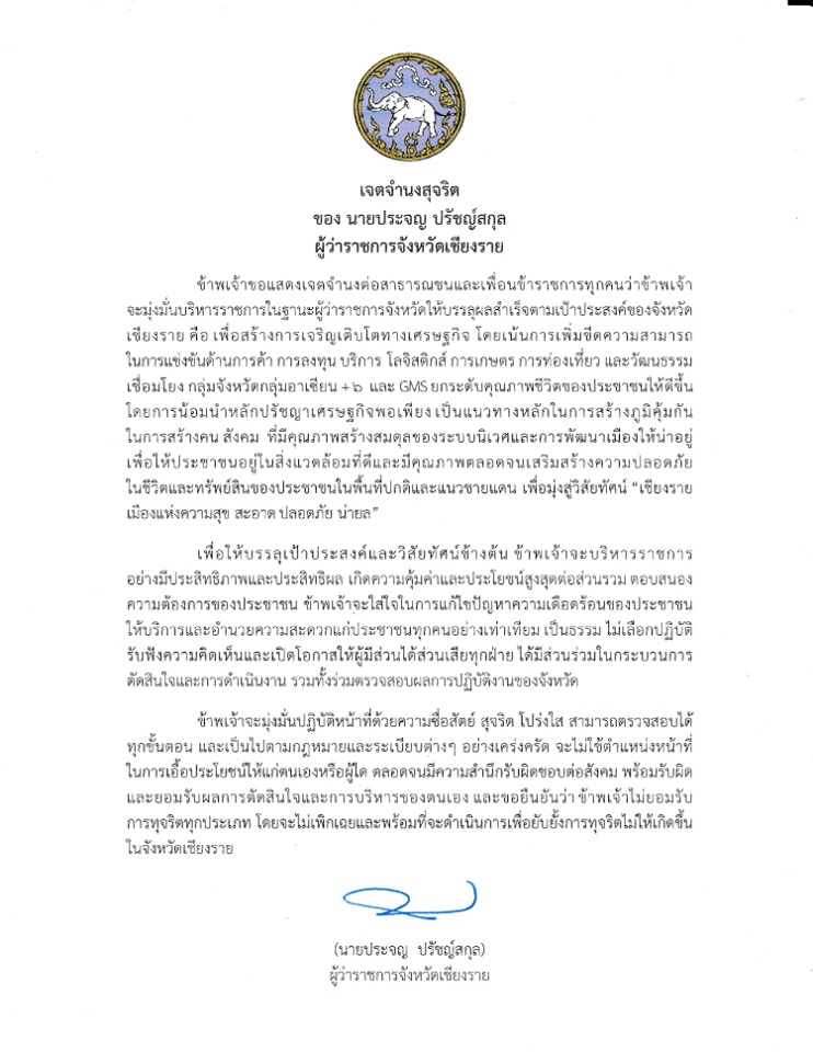 เจตจำนงสุจริต ของ นายประจญ ปรัชญ์สกุล ผู้ว่าราชการจังหวัดเชียงราย